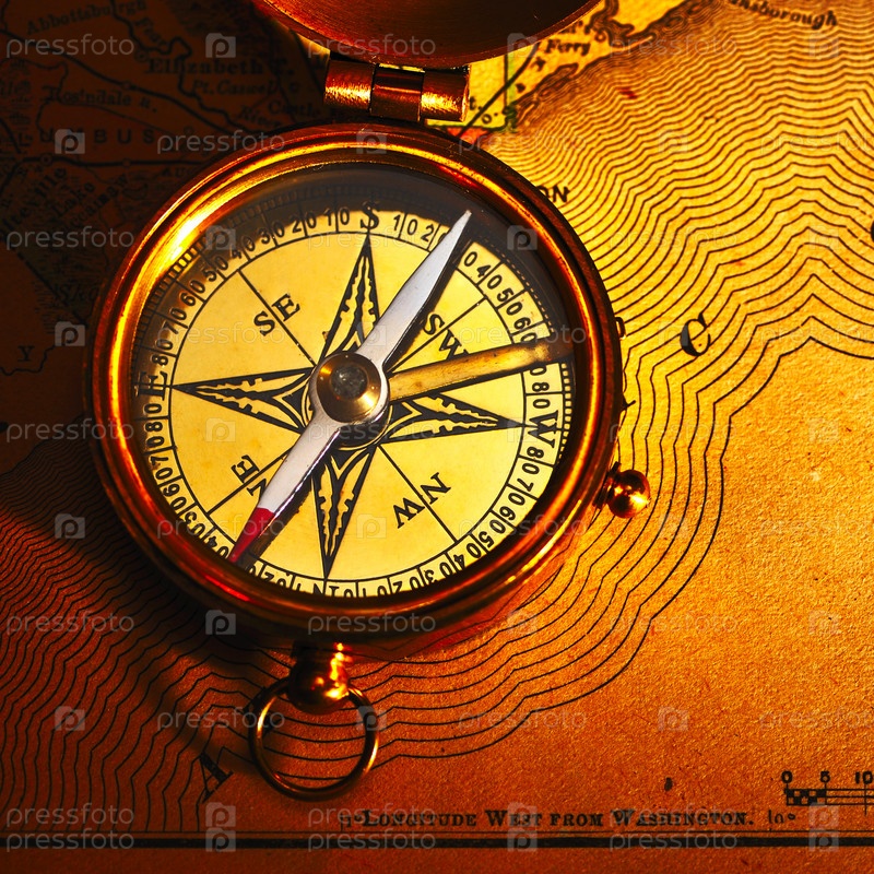 Старинный латунный компас на старой бумаге