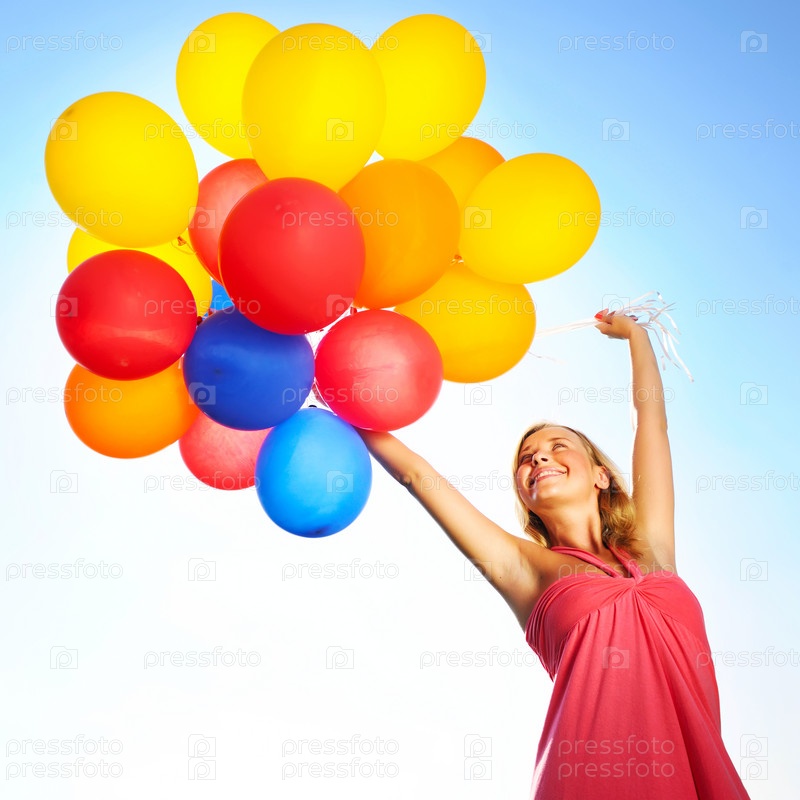 Женщина, держащая шары, на фоне солнца и неба