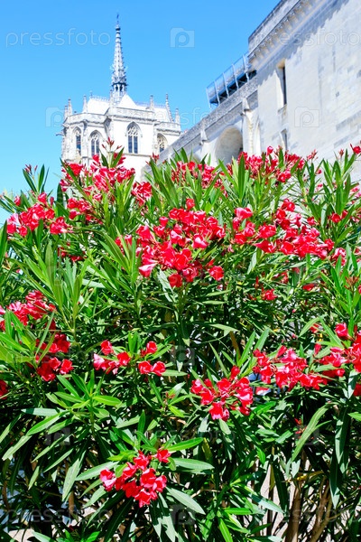 Цветущий олеандр на фоне замка в городе Амбуаз, Франция