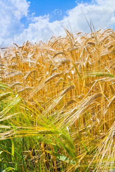 Спелые колосья пшеницы на фоне голубого неба с белыми облаками
