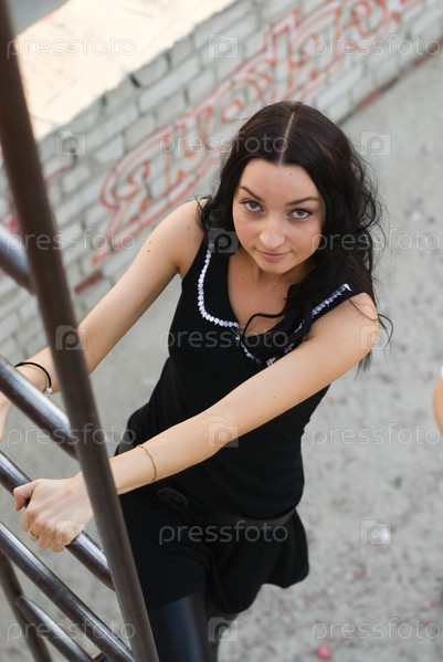 Молодая красивая женщина, на пожарной лестнице