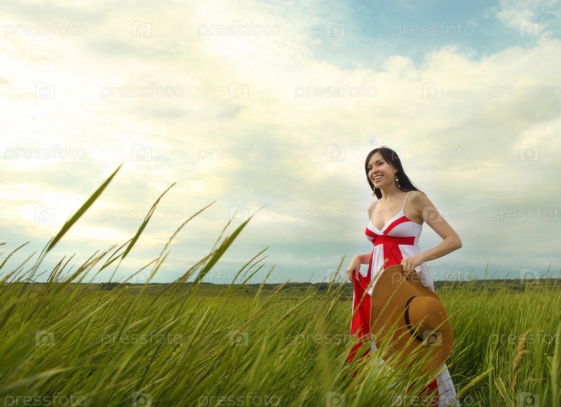 Молодая брюнетка на природе в летний день