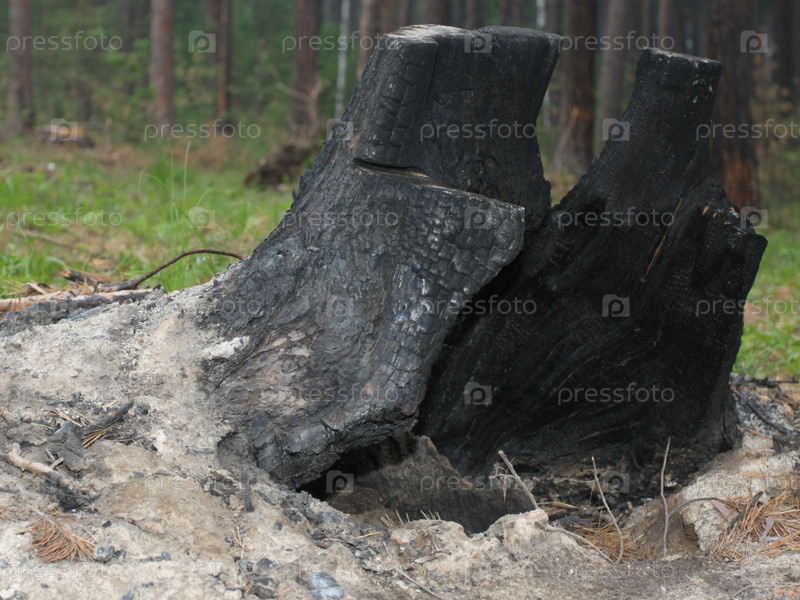 Обгоревший пень после лесного пожара на опушке леса в июне