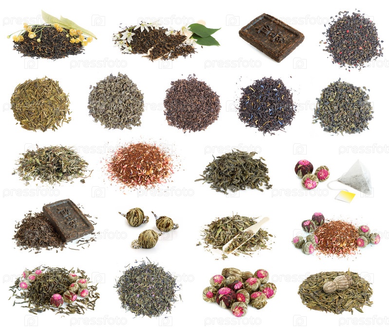 Большая коллекция чайных листьев на белом фоне