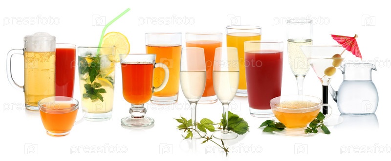 Большая коллекция свежих фруктовых напитков на белом фоне