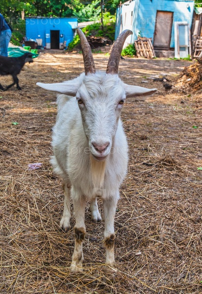 Домашний козел на ферме на фоне соломы
