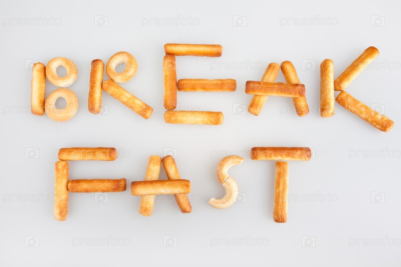 Надпись "завтрак" из хлебных палочек и сушек на белом фоне
