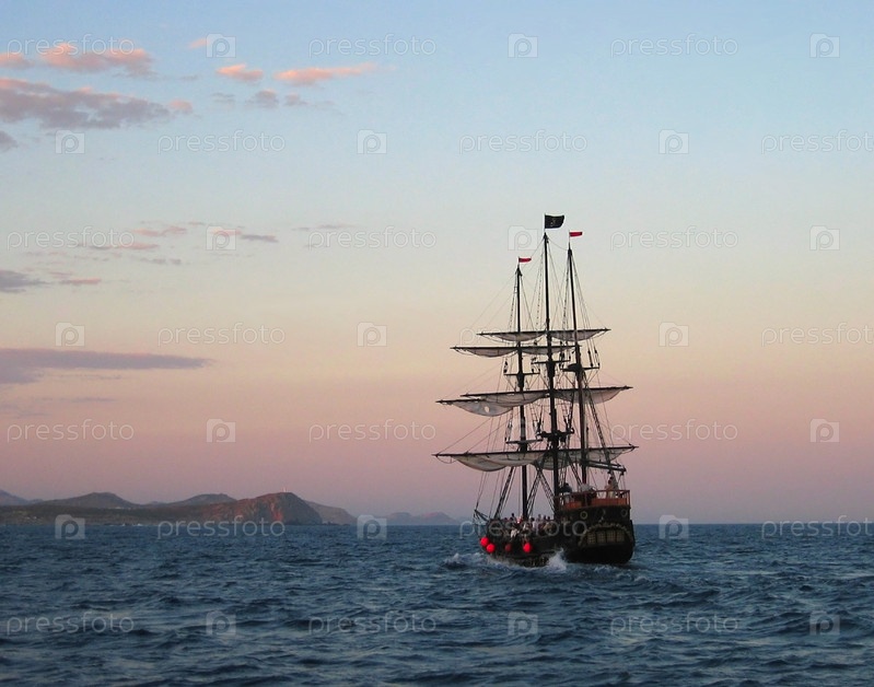 Парусный корабль в море на рассвете