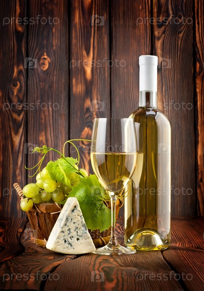 Бутылка белого вина, виноград и голубой сыр