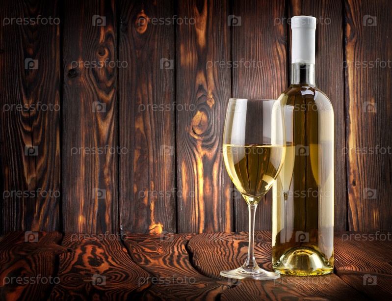 Бутылка белого вина на деревянном фоне