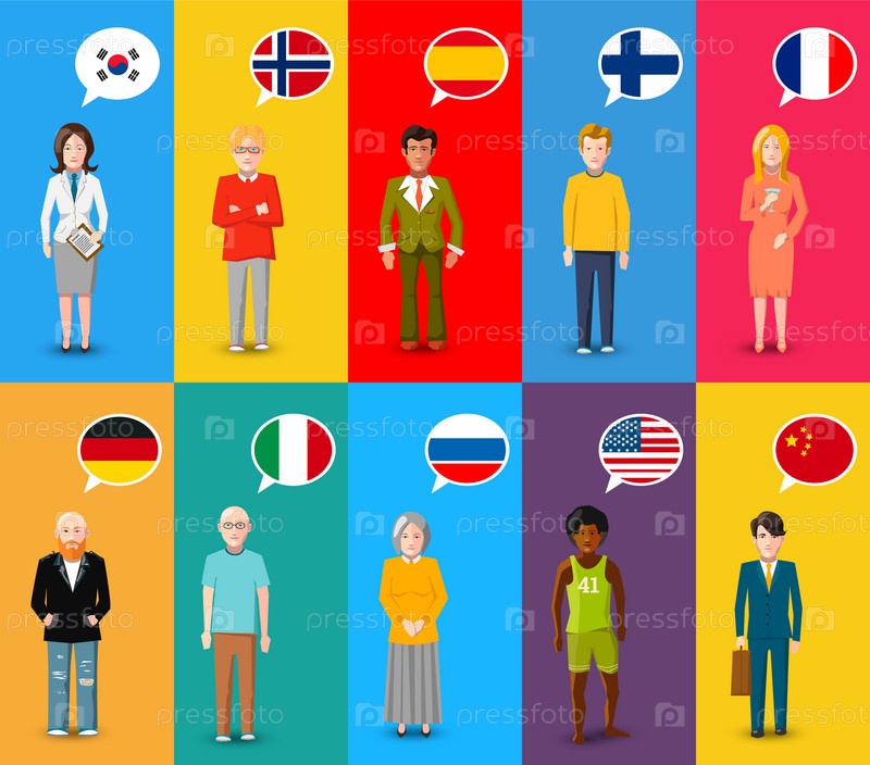 Красочные персонажи с речью пузыри с различными флагами стран