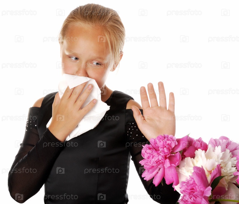 Девочка с аллергическим насморком отталкивает от себя букет пионов