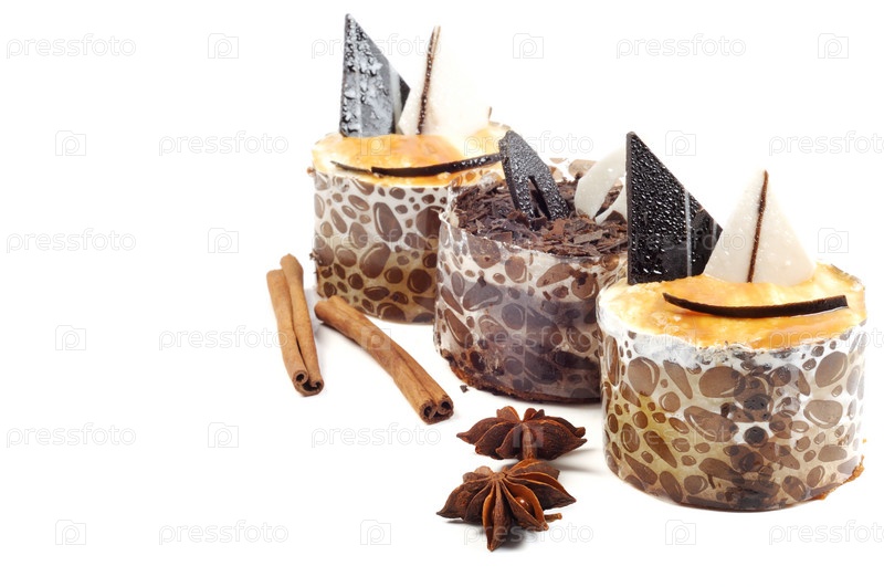 Три пирожных с кремом, анисом и корицей на белом фоне