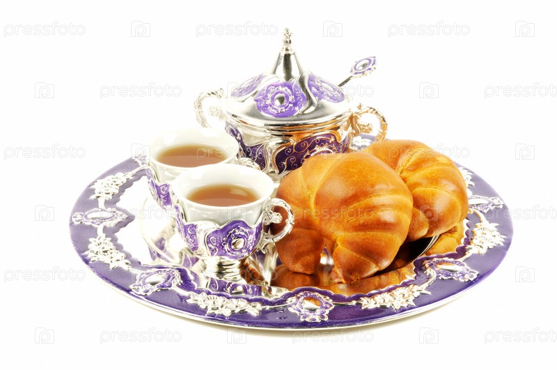 Чай со свежими круассанами на белом фоне