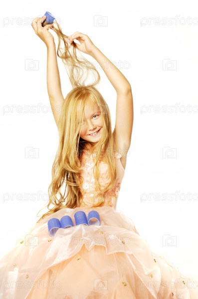 Красивая девочка с бигудями для завивки волос на белом фоне