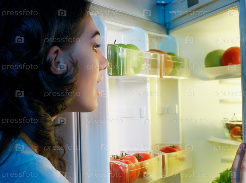 Голодная девушка смотрит в холодильник