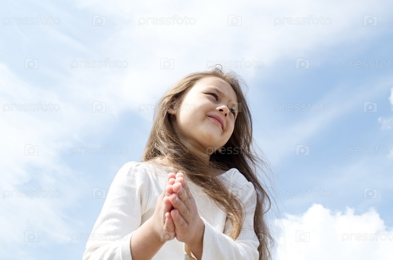 Девочка в белой блузке стоит со сложенными на груди руками на фоне неба