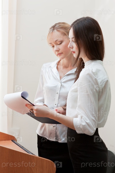 Учитель и ученица на трибуне в школе