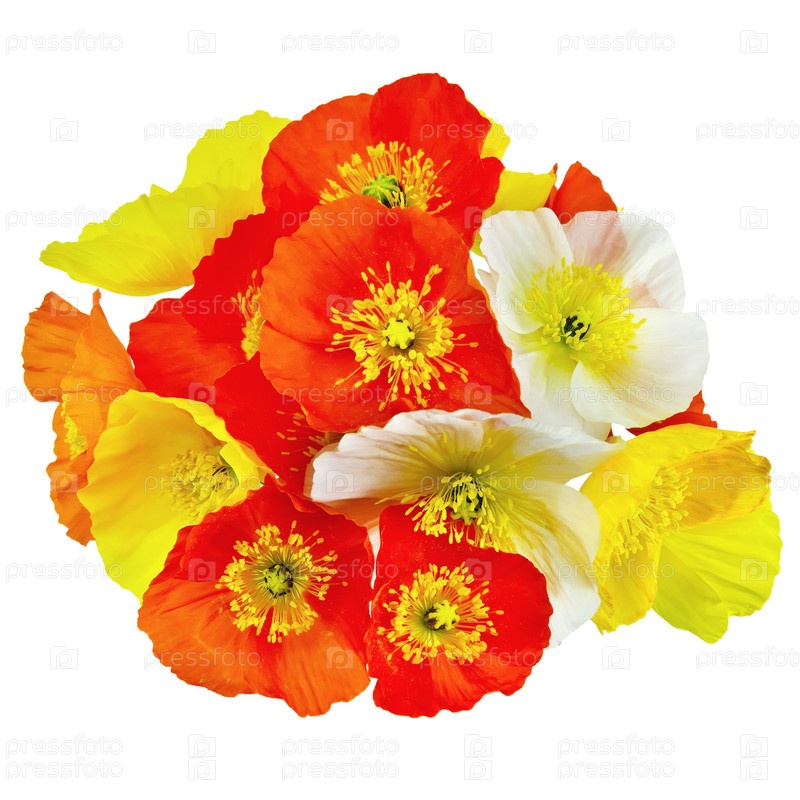 Букет оранжевых, желтых и белых маков на белом фоне