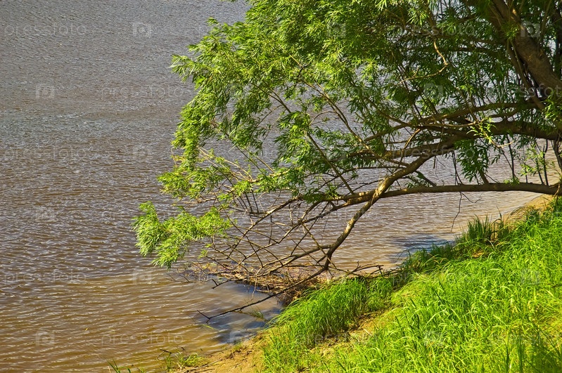 Дерево с зелеными листьями на берегу реки