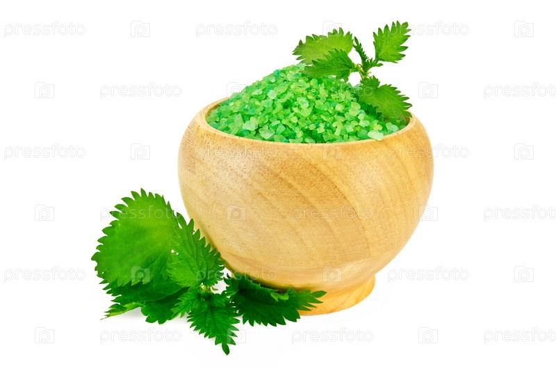 Зеленая соль для ванны в деревянной посуде с листьями крапивы на белом фоне
