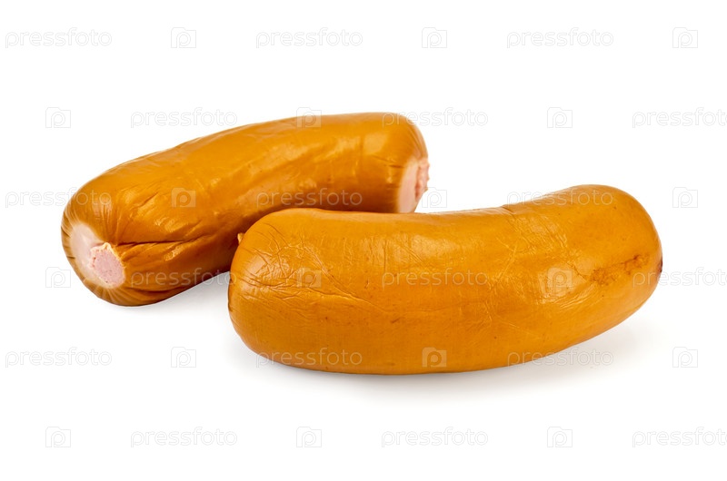 Две подкопченые сардельки на белом фоне
