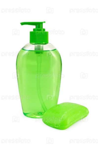 Зеленое жидкое мыло во флаконе и кусок зеленого твердого мыла на белом фоне