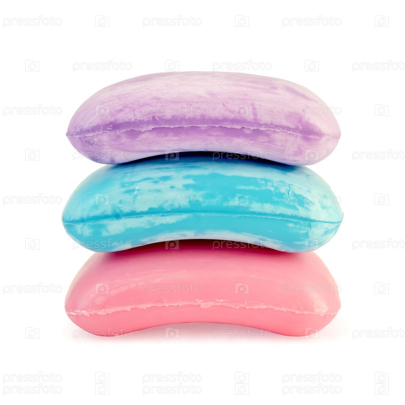 Три куска розового, голубого и сиреневого мыла на белом фоне