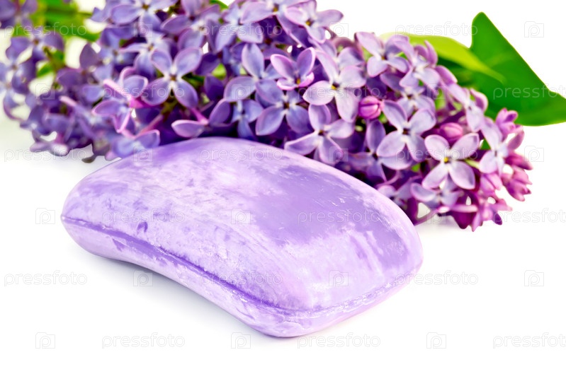 Один кусок сиреневого мыла с веточкой цветущей сирени на белом фоне