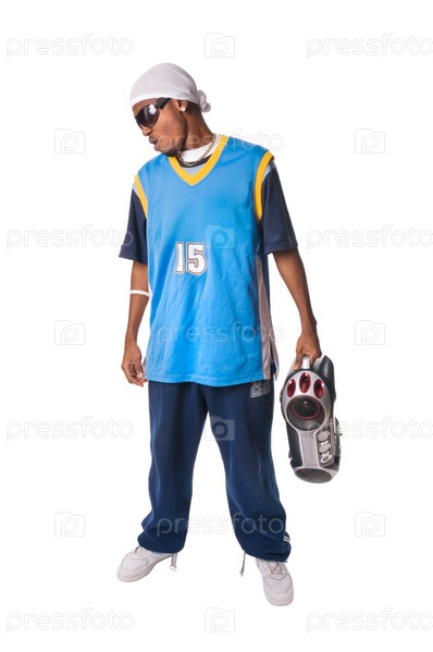 Темнокожий молодой человек в спортивной одежде для танцев и с магнитофоном в руках на белом фоне