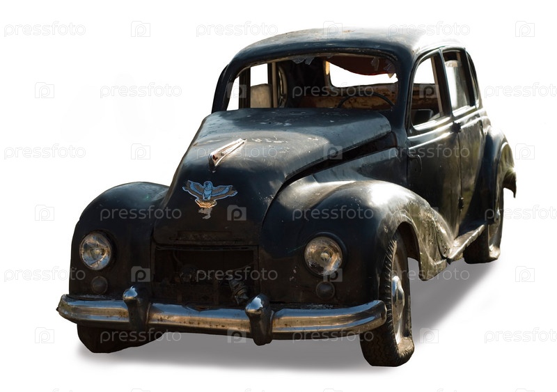 Старый разбитый автомобиль на белом фоне