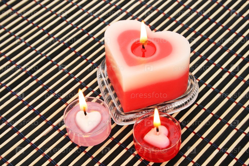 Красные и розовые свечи на деревянном коврике