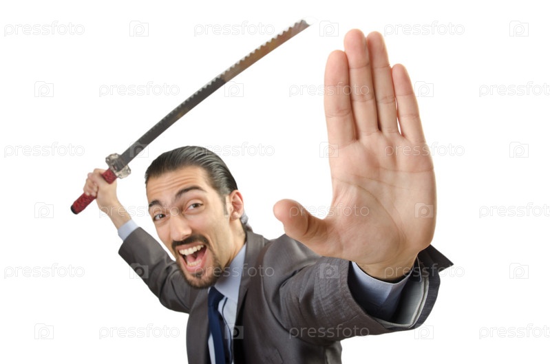Предприниматель с мечом на белом фоне