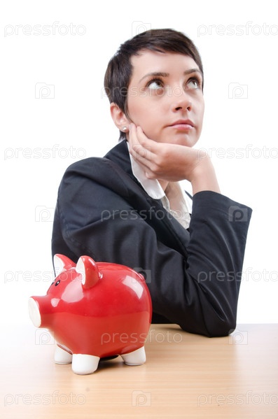 Женщина и копилкой на белом фоне