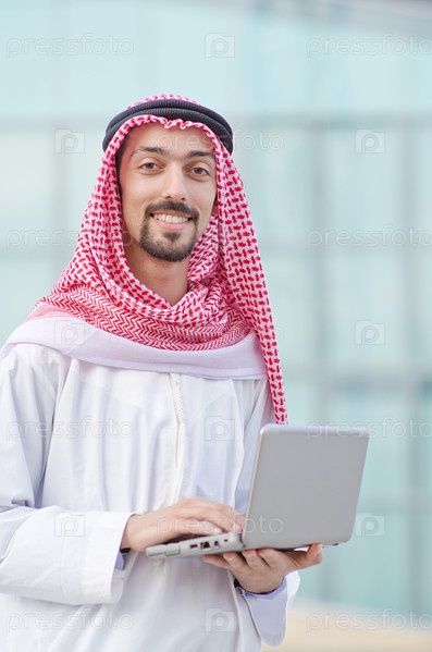 Портрет успешного мужчины-араба с ноутбуком на улице