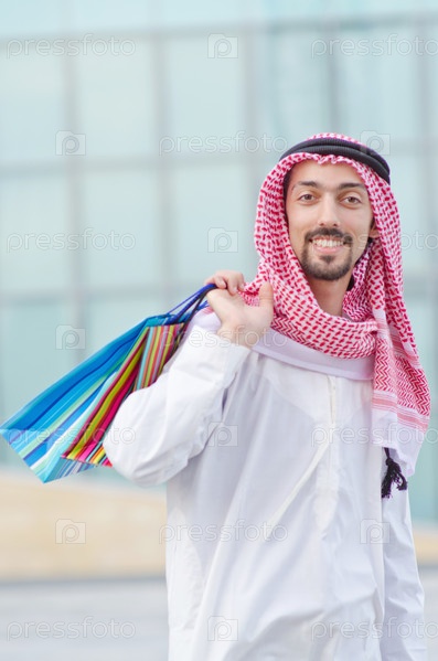 Улыбающийся мужчина-араб с сумками на улице