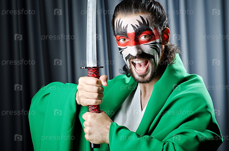 Мужчина с маской на лице и мечом в руках