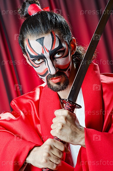 Мужчина с маской на лице и мечом в руках