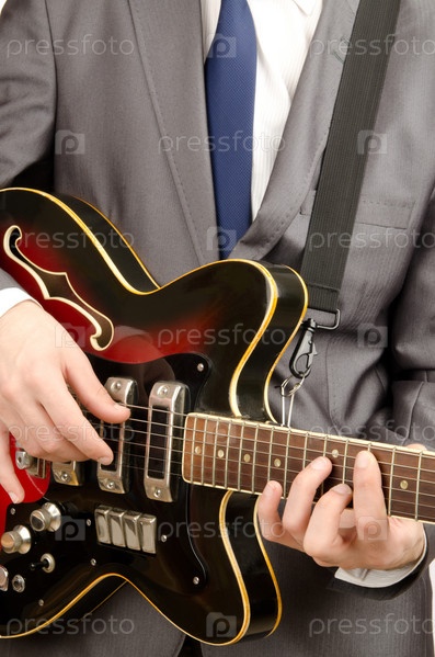 Молодой гитарист в деловом костюме на белом фоне