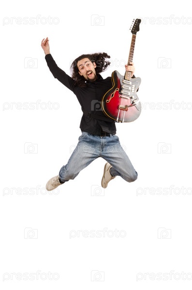 Молодой гитарист на белом фоне