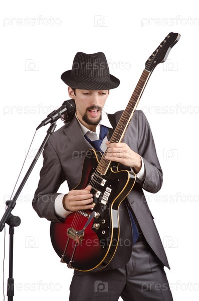 Молодой гитарист на белом фоне
