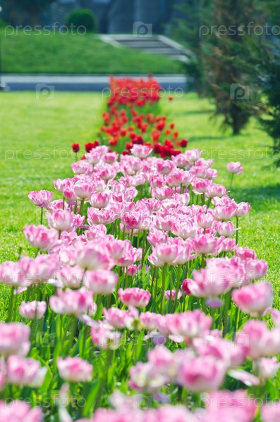 Сад с цветами тюльпанов в летний день