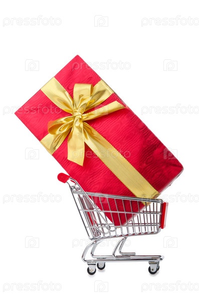Большая подарочная коробка с бантом в корзине на белом фоне