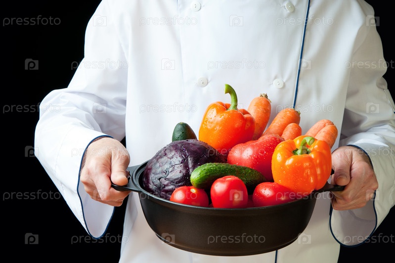 Шеф-повар с овощами на черном фоне