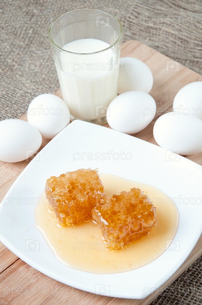 Медовые соты, яйца и молоко