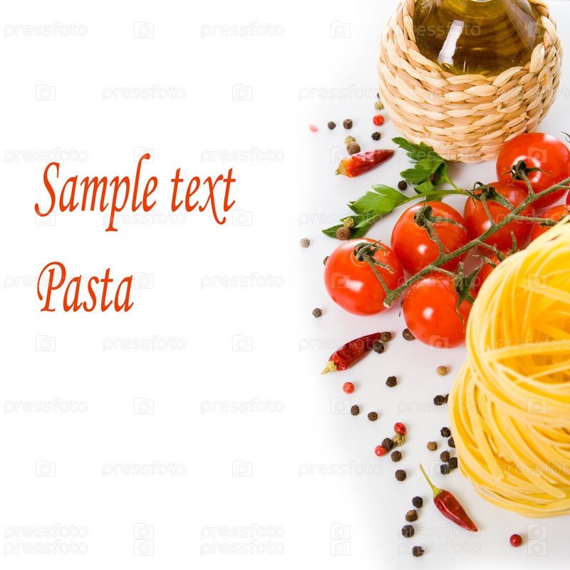 Свежие овощи и макароны на белом фоне