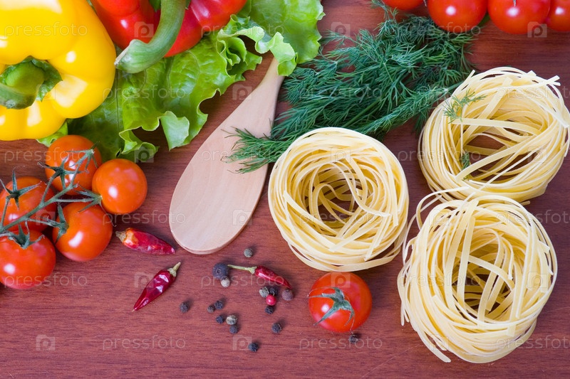 Свежие овощи и макароны на столе