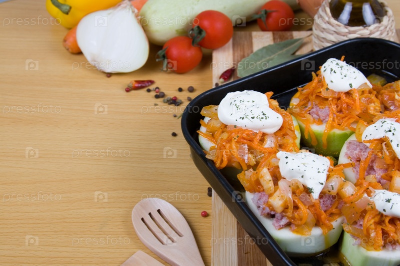 Приготовление цуккини, фаршированных мясом, на деревянном столе