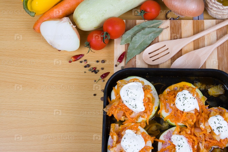 Приготовление цуккини, фаршированных мясом, на деревянном столе