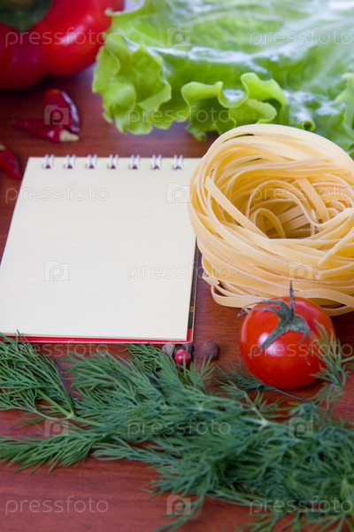 Блокнот, паста и свежие овощи на деревянном столе